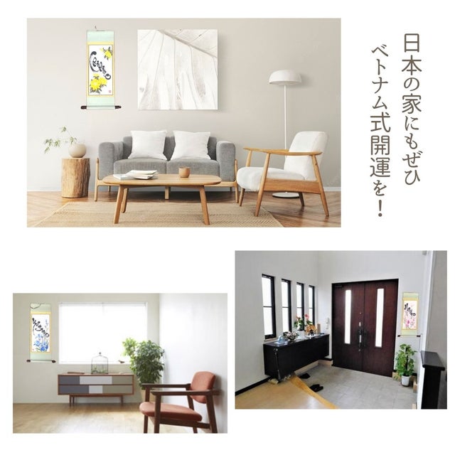 日本で、掛け軸といえば「和室の床の間に飾るもの」というイメージがあるかと思います。ベトナムの家には床の間はありません。掛け軸は、家の中の家族が集まる場所や、玄関に大事に飾られています。床の間がない日本の家でも、洋風建築の家でもよく合います。上品なデザインのベトナム書法の掛け軸は、柔らかい優しい雰囲気を作り出し、見る人全ての心を穏やかにし、良い運気を運んでくれます。