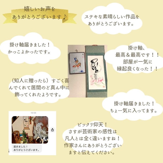 以上のことから「幸せ」の連鎖を生み出し、掛け軸を応援購入いただいた皆さんにより多くの運気や幸せの高波動が舞い込んでくれると信じています。