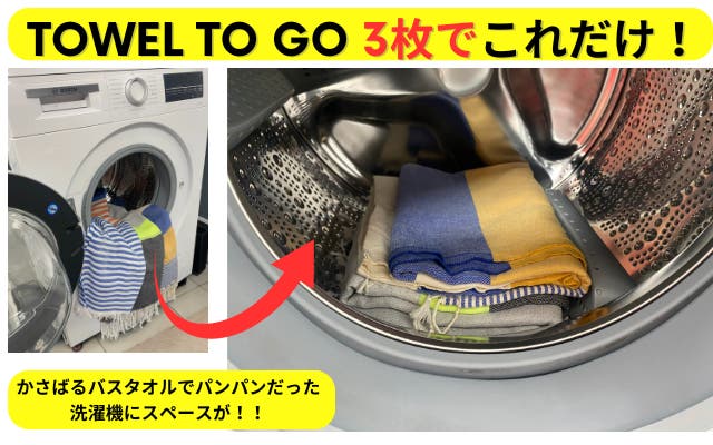 家族の人数が多ければ多いほどタオルを洗濯する量も増えて大変です。TOWEL TO GOハマムタオルならコットン性パイル生地バスタオルの半分以下のサイズでコンパクトになります。
