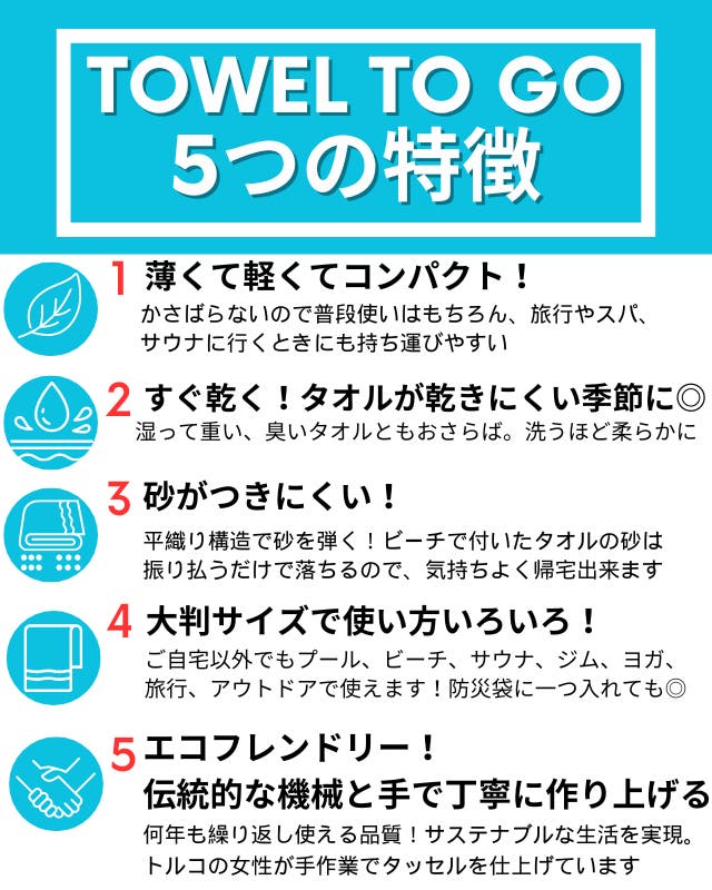 TOWEL TO GOハマムタオルは身体を拭くだけでなく、着たり羽織ったり首に巻いたり、敷いたり、日よけにしたり、テーブルクロスにしたりと様々なシーンで活躍する便利な織物なのです。いざという時のために防災袋に1枚入れてもいいですね!