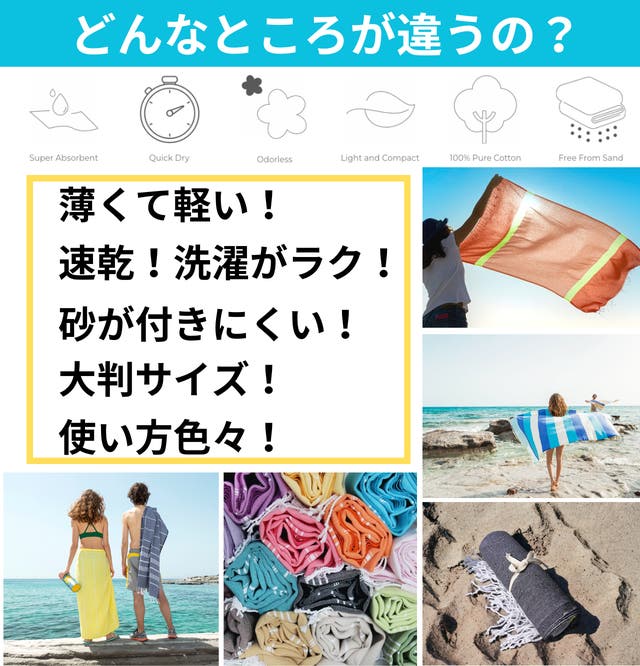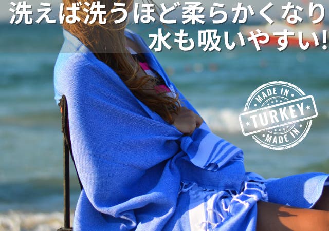 ハマムタオルは、その軽さと速乾性、そして抜群の吸水性で知られています。ビーチでの使用はもちろん、日常生活でもその魅力を実感していただけると確信しています。
