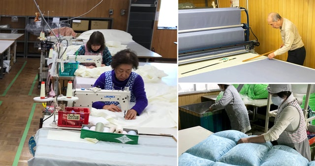 愛知県津島市のこの工場では、裁断・羽毛の充填・袋詰めまでの全行程を行っています。