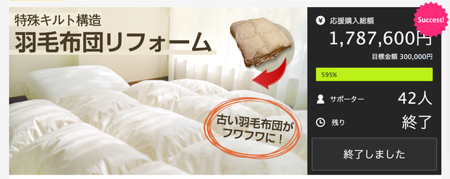 ※羽毛布団のリフォーム・生産については、本プロジェクトの進行状況を確認しながら調整し、なるべく早くお客様の元へお届けできるように致します。