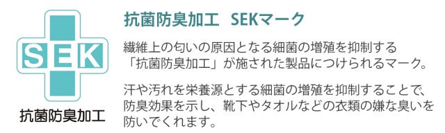 SEKマークとは、繊維製品に使用する加工剤と製品の両面から安全性と性能を評価する試験を実施し、要件をクリアした製品にのみ与えられます。