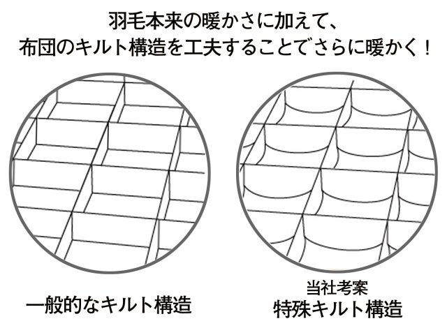 特殊キルト構造の側生地を使用することで、今までと同じ量の羽毛を使用しても、断然暖かい羽毛布団に仕上がるのが弊社商品の最大の強みです。