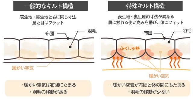 特殊キルト構造は、人と布団の間にできた空間に、体から出た熱が”ふくしゃ熱”となり溜め込まれるため、心地よい自然なあたたかさを生み出します。