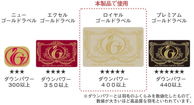 その際に追加する羽毛は、ダウンパワー400以上の、ロイヤルゴールドラベルを取得した羽毛を採用。