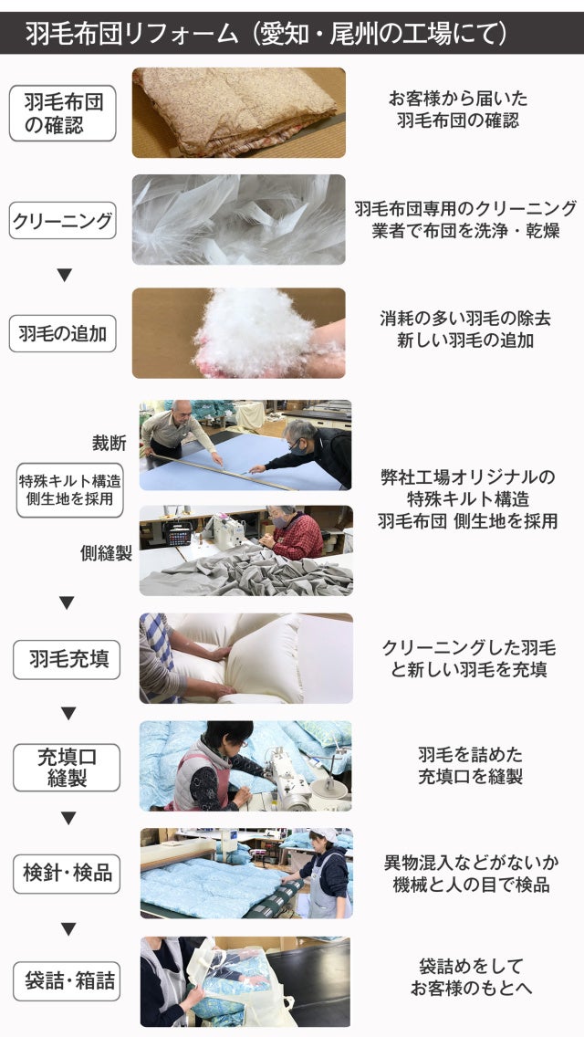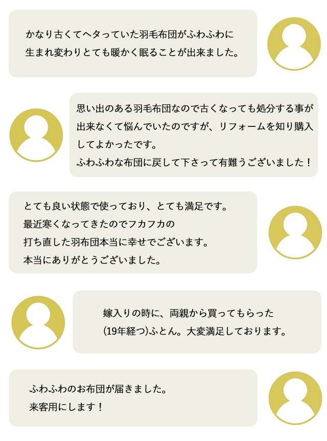 - どれだけ古い羽毛布団でも、異なるサイズでも、国内工場で職人がふわふわにリフォーム