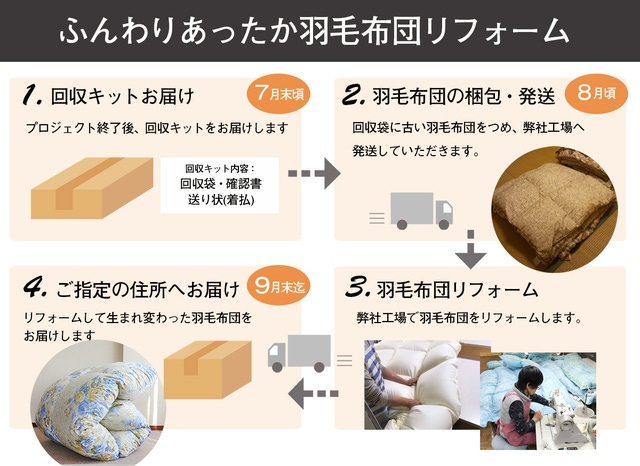 ※羽毛布団のリフォーム・生産については、本プロジェクトの進行状況を確認しながら調整し、なるべく早くお客様の元へお届けできるように致します。