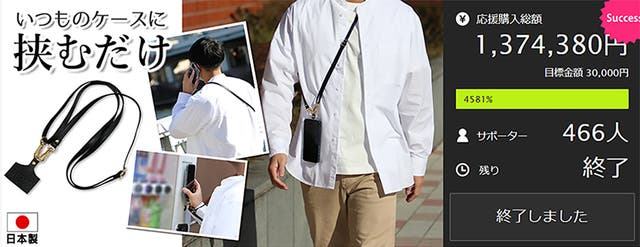 前回の「 【信頼の日本製】スマホに挟むだけ。ショルダーストラップで新たな快適習慣を。」は466人のサポーターの方から合計1,374,380円が集まりました。