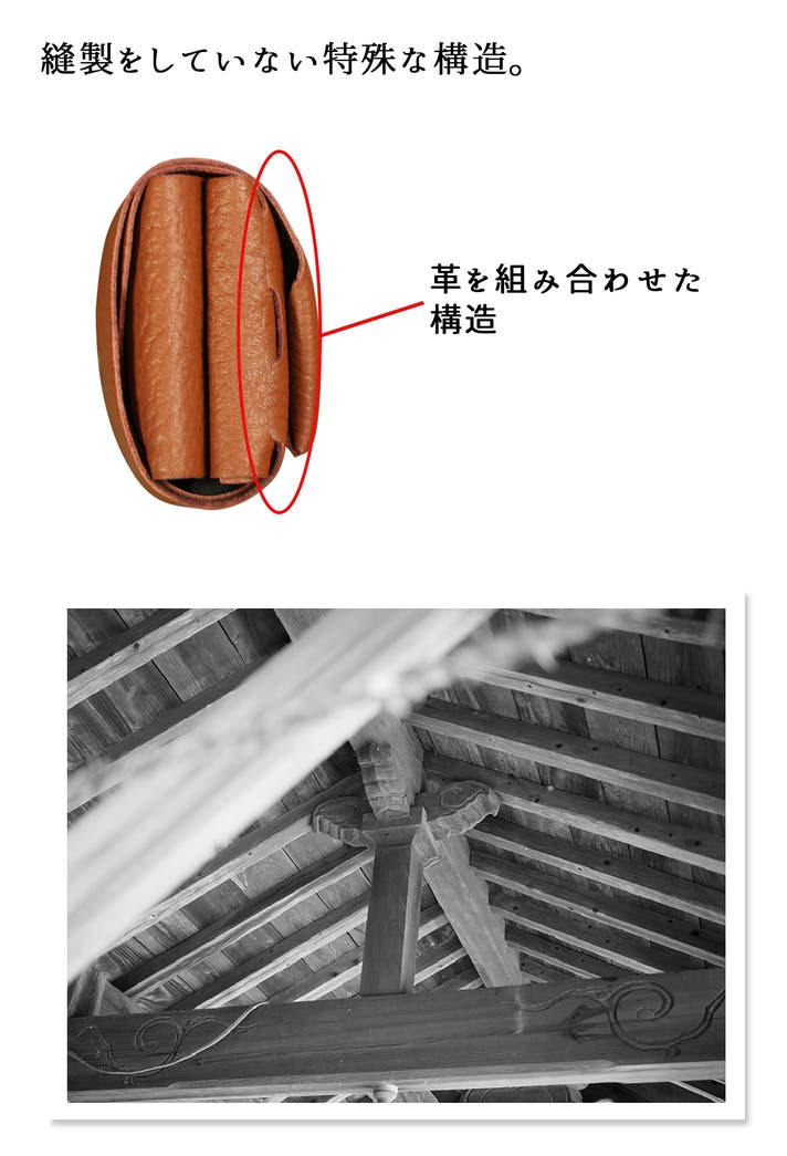 建築で、木と木を組み合わせる事で、力強い骨組をつくる伝統工芸「木組み」からイメージしてデザインした縫製しなくて丈夫なコンパクト財布。
