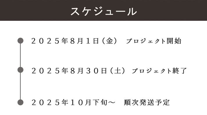 ※応援購入の数が想定を上回った場合や、製造工程上の都合や配送作業に伴う止むを得ない事情により出荷時期が遅れる場合がございます。遅れる場合は活動レポートにてご連絡させて頂きます。