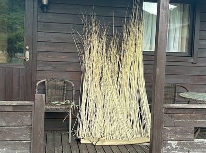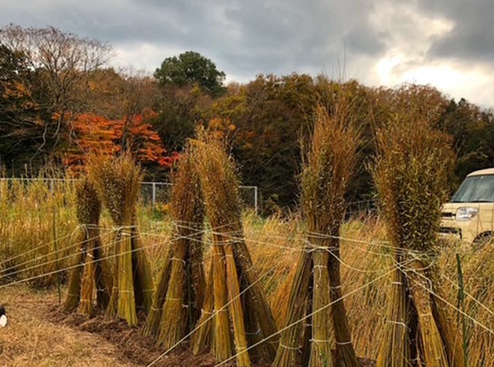 秋になったらコリヤナギの収穫が始まります。刈り取った柳を束ねて冬を越し乾燥ささせます。