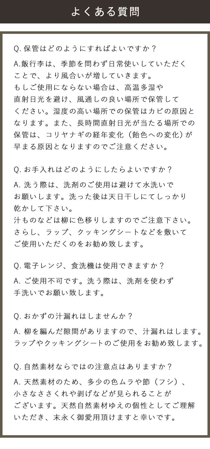 デザインは、昔ながらの飯行李は細長く高さが無い物が多いのですが、今回販売する飯行李は少しサイズアップさせて使い勝手の良いサイズ感に改良しました。