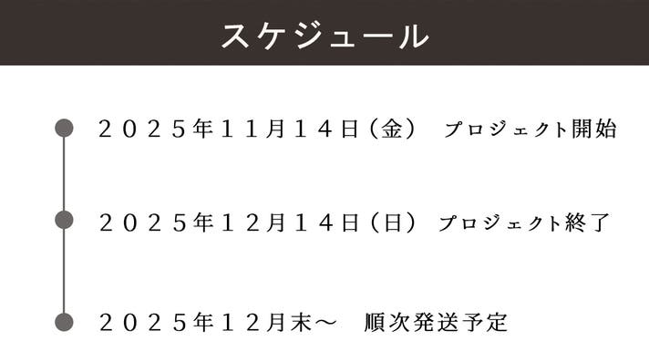 このプロジェクトはAll in型です。目標金額の達成に関わらず、プロジェクト終了日の2025年12月14日までに支払いを完了した時点で購入が成立します。