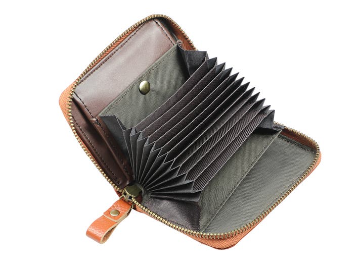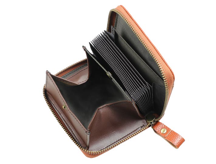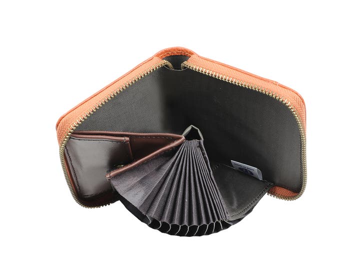 開閉は安心なファスナータイプで、内側にはジャバラ式に開くカード入れを搭載。