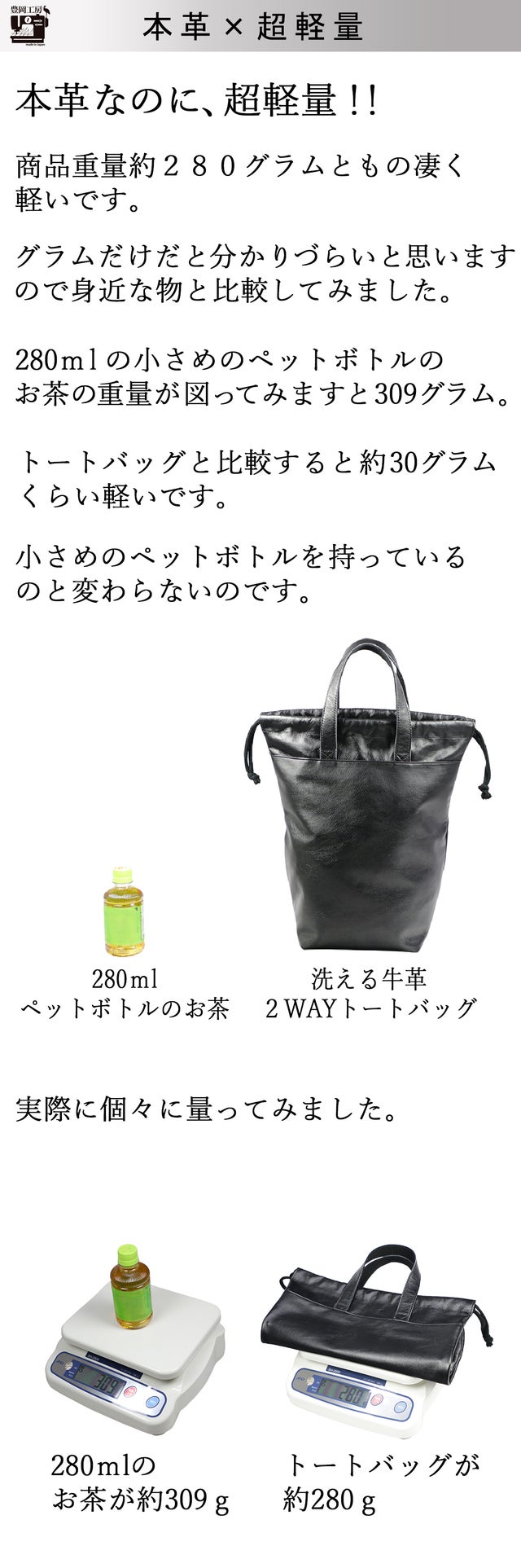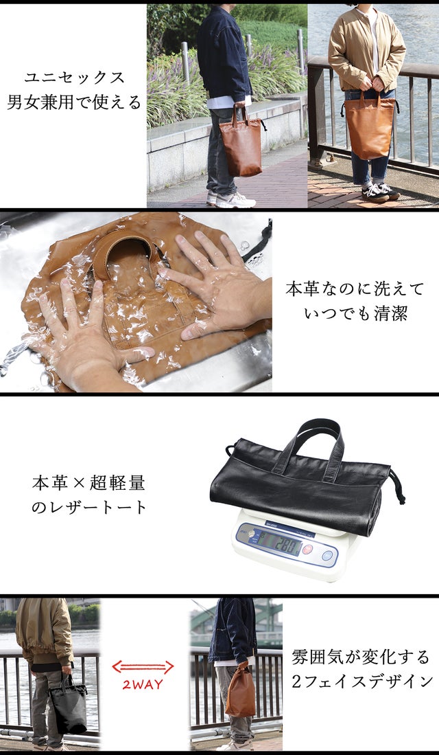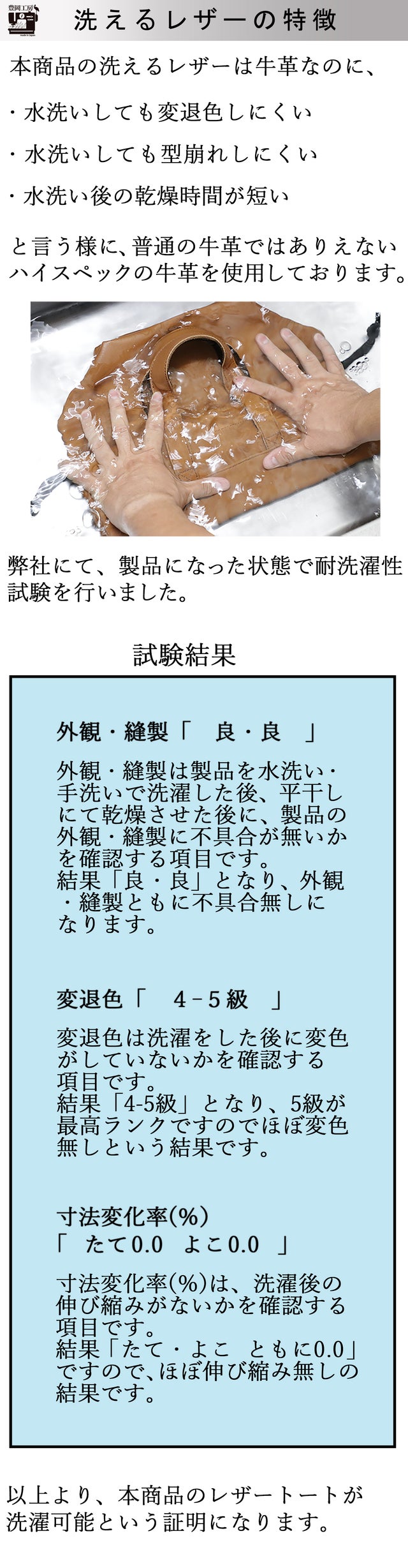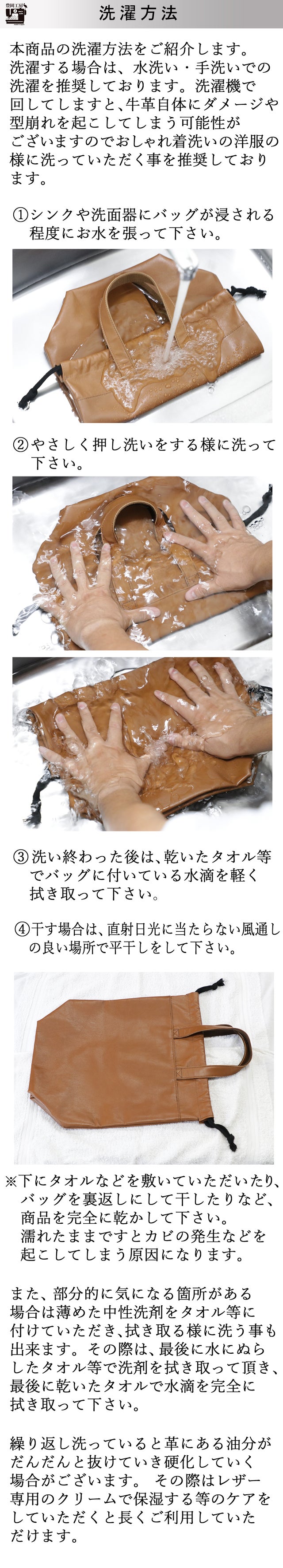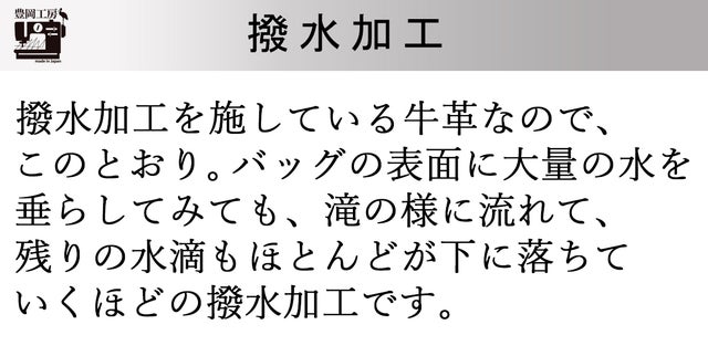 - 明治40年に創業、「豊岡工房」で初、まるごと洗えるレザーバッグ。