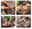 島に自生するテーチ木(学名:車輪梅)の気をチップ状に砕き、大きな窯で2日ほど煮込み4~5日程寝かせて煮汁を自然発酵させます。