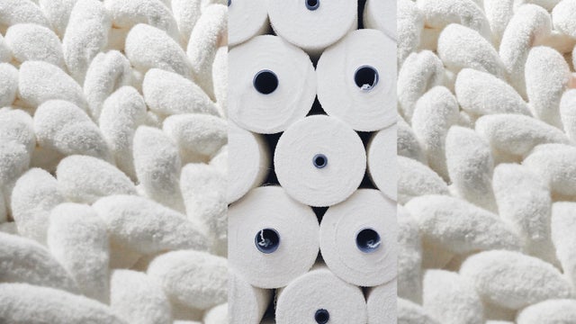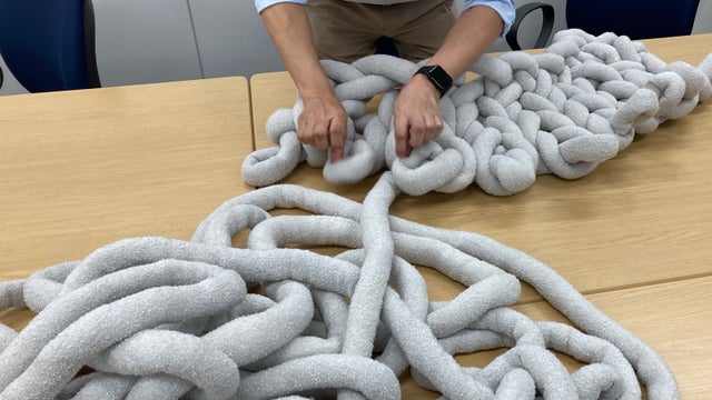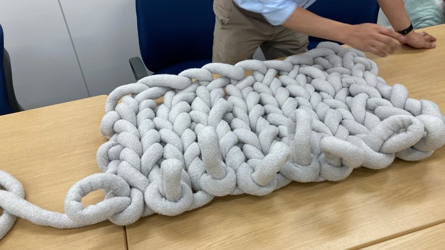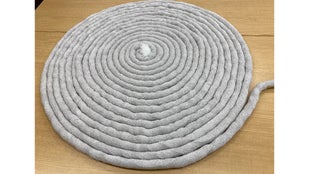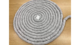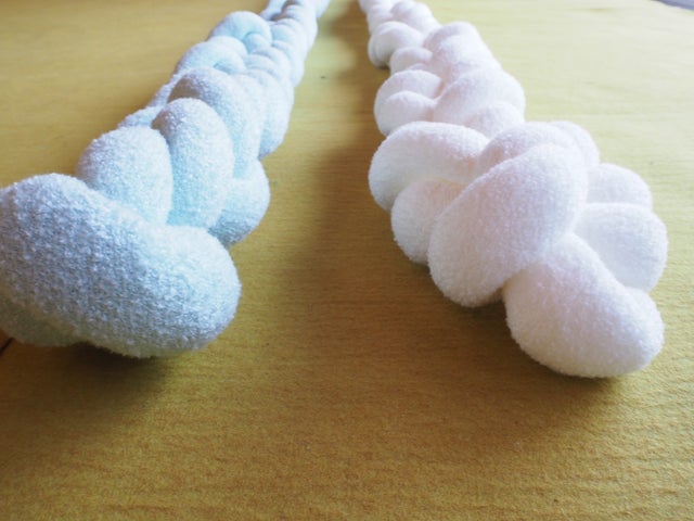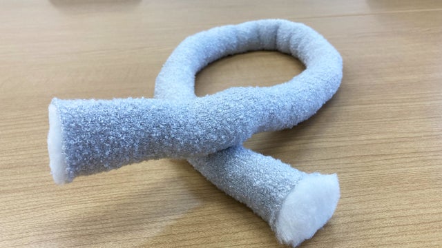 中味はペットボトルを再生しトウ状にした綿を分繊してふくらませたふわふわの綿を使用。ふわふわチューブニットが完成。