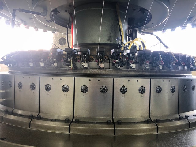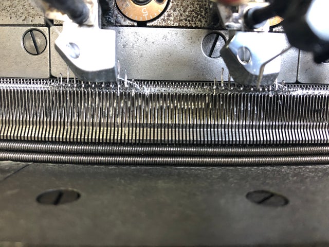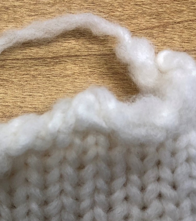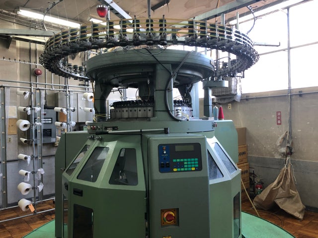通常のウールニットガーメントを作るには、ウールのわたを伸ばしながら撚りをかけて糸にします。その糸を丸編機でガーメントを作り、縮絨や洗いなどの工程を通り、コート用の生地にします。