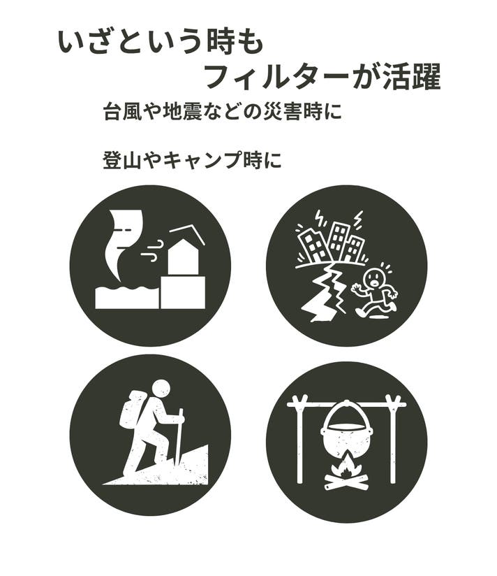 ※本製品は海水の淡水化、重金属・溶解した化学物質・ウイルスの完全除去を目的としたものではありません。