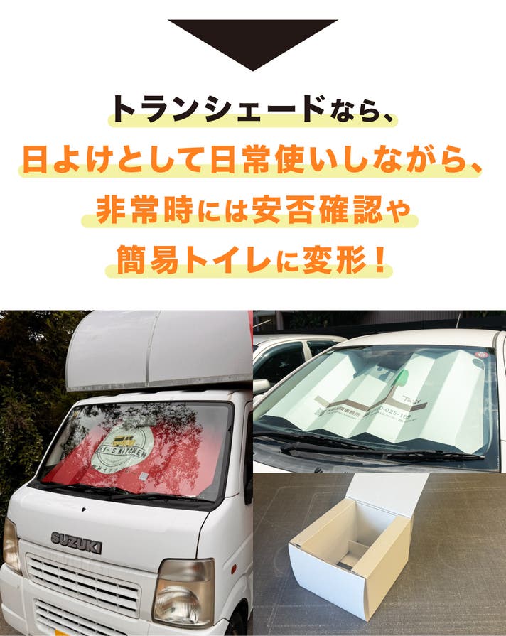 A.トランシェードはダンボール製です。簡単に加工していただけますので、どのような車種にもお使いいただけます。但し、お客様による加工・改造を行った場合、製品の保証・返品・交換の対象外となります。加工・改造による破損や機能不良については、当社では一切の責任を負いかねます。