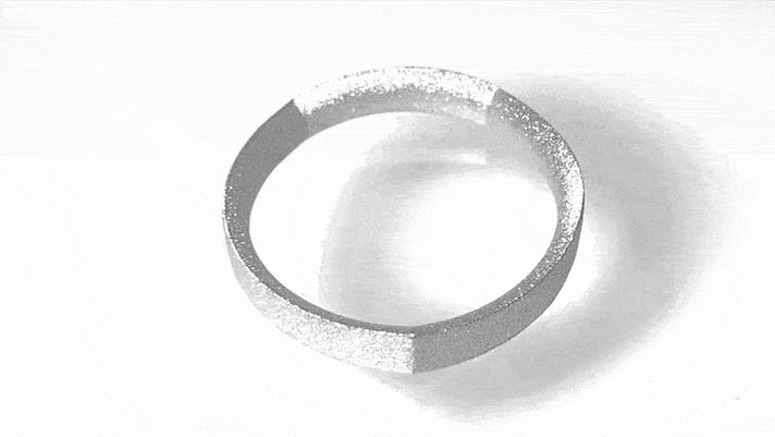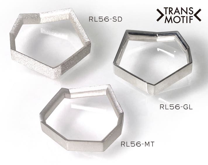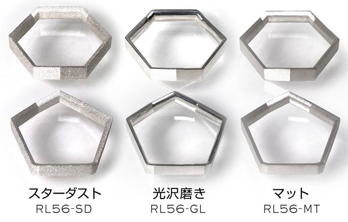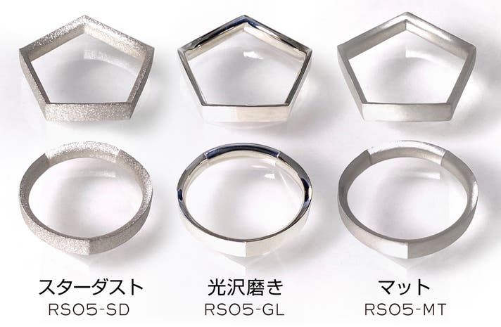 3種の表面仕上げをお選び頂けます。それぞれに雰囲気が違って素敵です。平面や手のひらに置き、特定の方向から45°に見下ろすと丸く、その反対側から見ると五角形に見えます。指にはめると、とても薄く見えてスタイリッシュ!