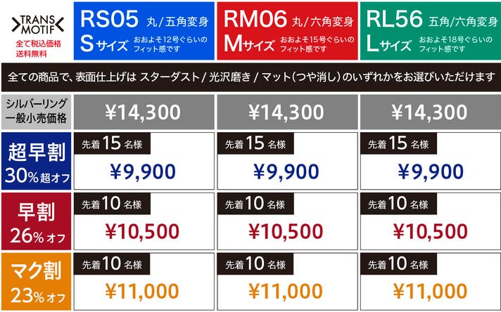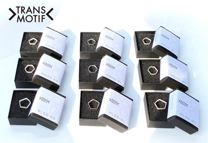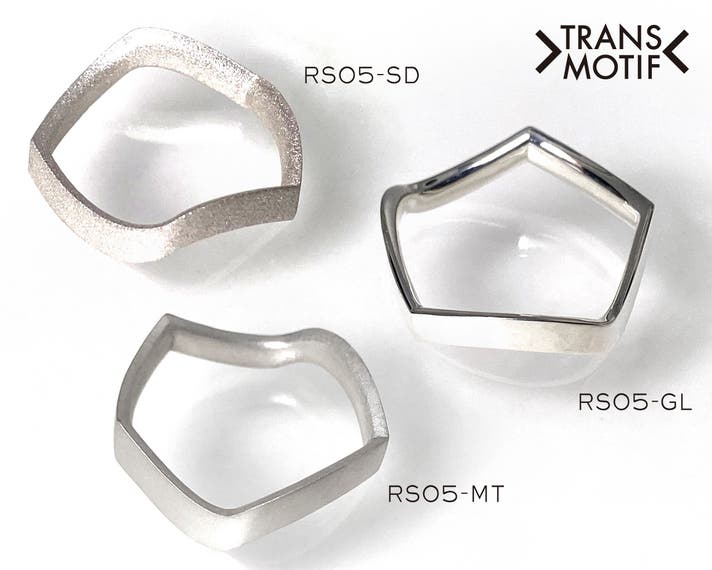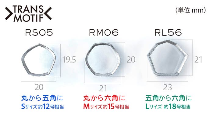 トランスモティーフは、通常のリングのように製造後のサイズ調整はできず、ひとつの形状×ひとつのサイズごとに原型と生産型が必要です。その中でバリエーションの確保とお手頃価格を実現するために悩んだあげく、デザインごとにサイズを固定することにしました。お好きなデザインだとサイズが合わない、という場合がどうしても出てきてしまうことを、あらかじめお詫び申し上げます。ごめんなさい。m(_ _)m