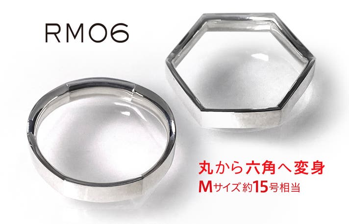 RM06タイプは、丸から六角形へ変身するリングです。Mサイズで、フィット感としては、約15号に相当します。(14号〜16号が守備範囲)