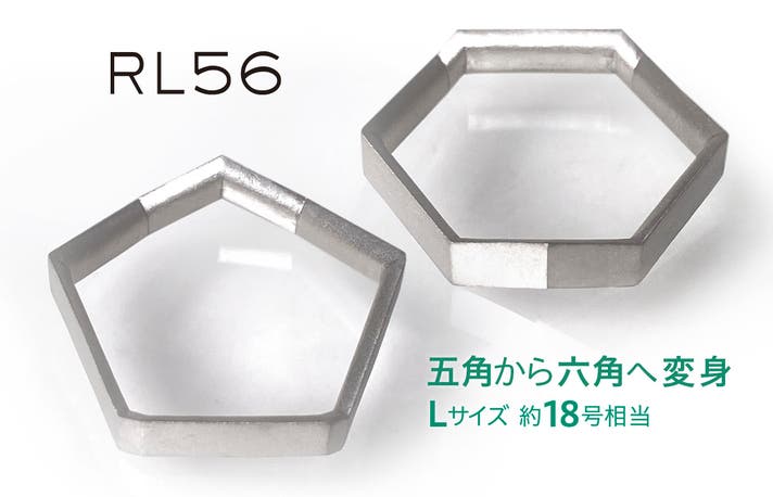 RL56タイプは、五角形から六角形へ変身するリングです。Lサイズで、フィット感としては、約18号に相当します。(17号〜19号が守備範囲)