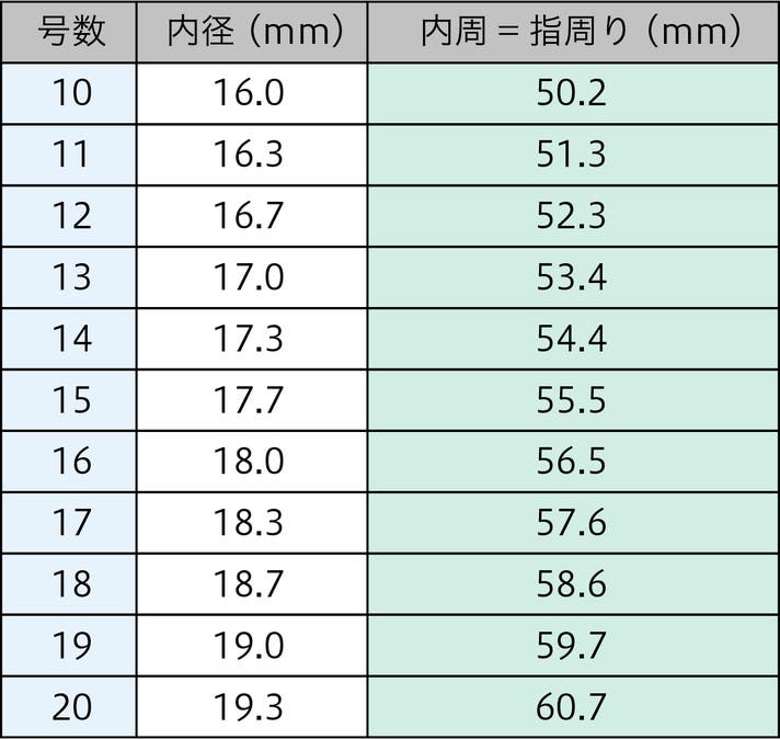 ご自身のリングサイズが不明の場合は、お近くの宝飾店での計測、お持ちのリングを測ってみる、もしくは下の一覧表をご参照ください。