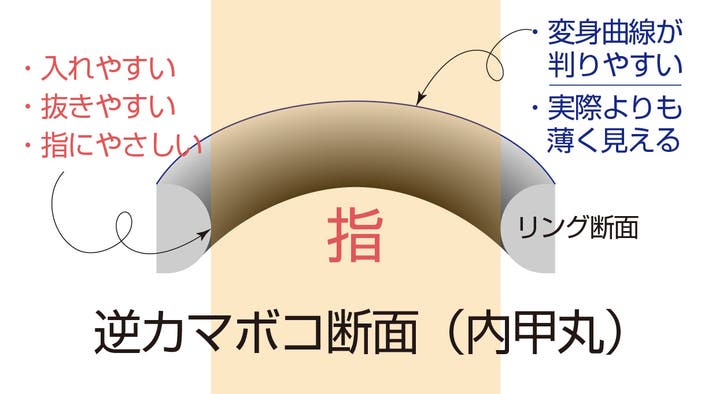 ・逆カマボコ断面(内甲丸)で、心地よいフィット感と美しい変身を両立。