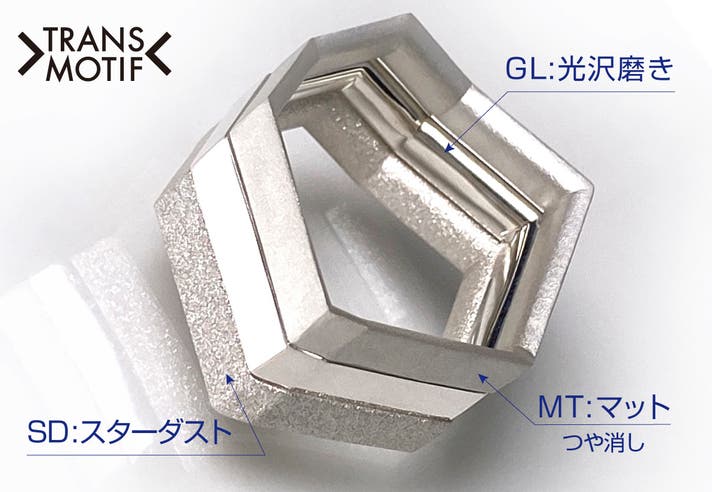 合格へと繋がる五角と、安定と強さ、長寿を表す六角が融合しました。共に多角形なので、他の2つのリングと異なり、直線だけで構成されているところが特徴です。