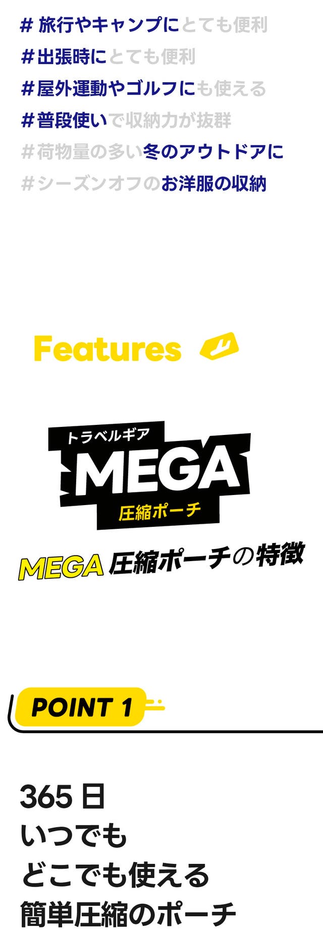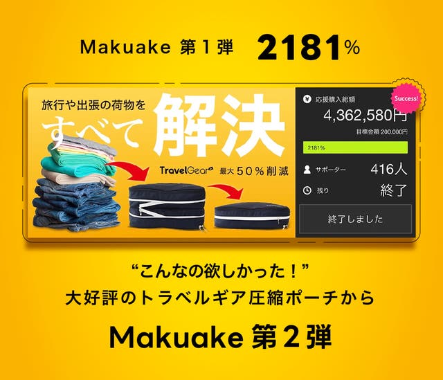 「Makuake(マクアケ)」は、実行者の想いを応援購入によって実現するアタラシイものやサービスのプラットフォームです。このページは、 プロダクトカテゴリの 「大量の荷物が瞬時にコンパクトに。旅行や収納に大活躍の圧縮ポーチ、MEGA登場!」プロジェクト詳細ページです。