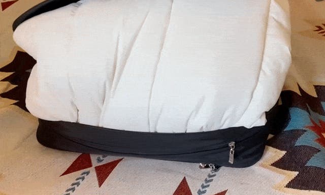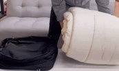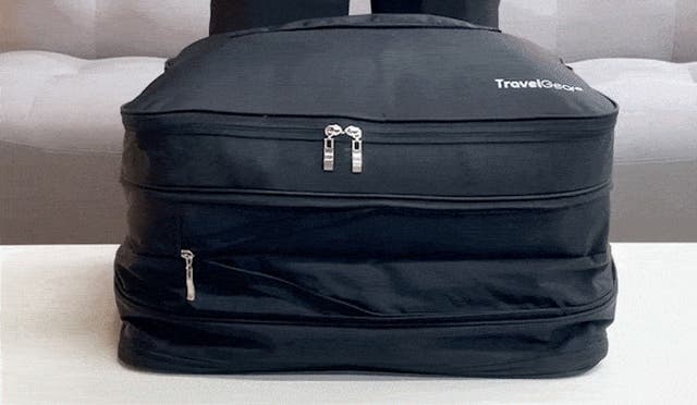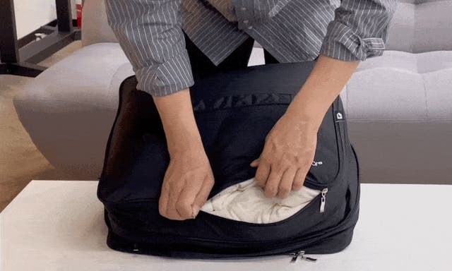 A :半分ほどまで圧縮可能ですが衣類の形と素材によっては圧縮率が少ないものもあります。また、無理に入れすぎるとファスナーの破損の原因になりますので完全開き状態で約90%程度でまとめることをおすすめします。