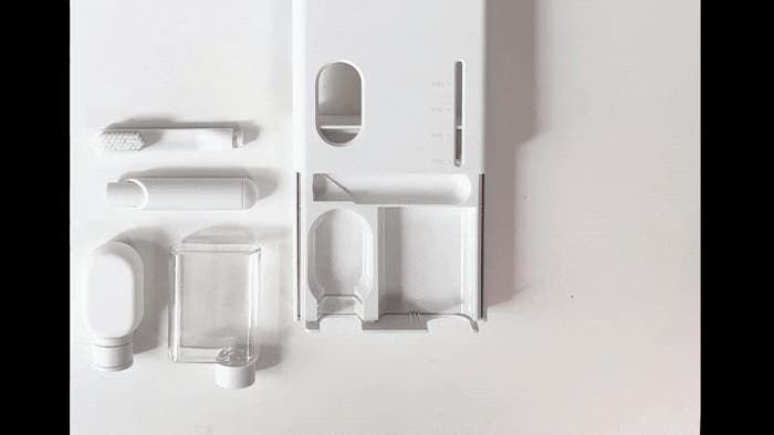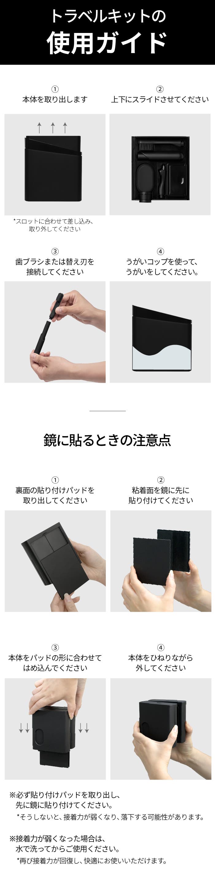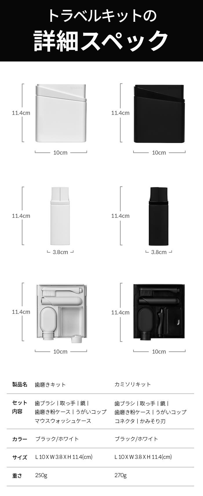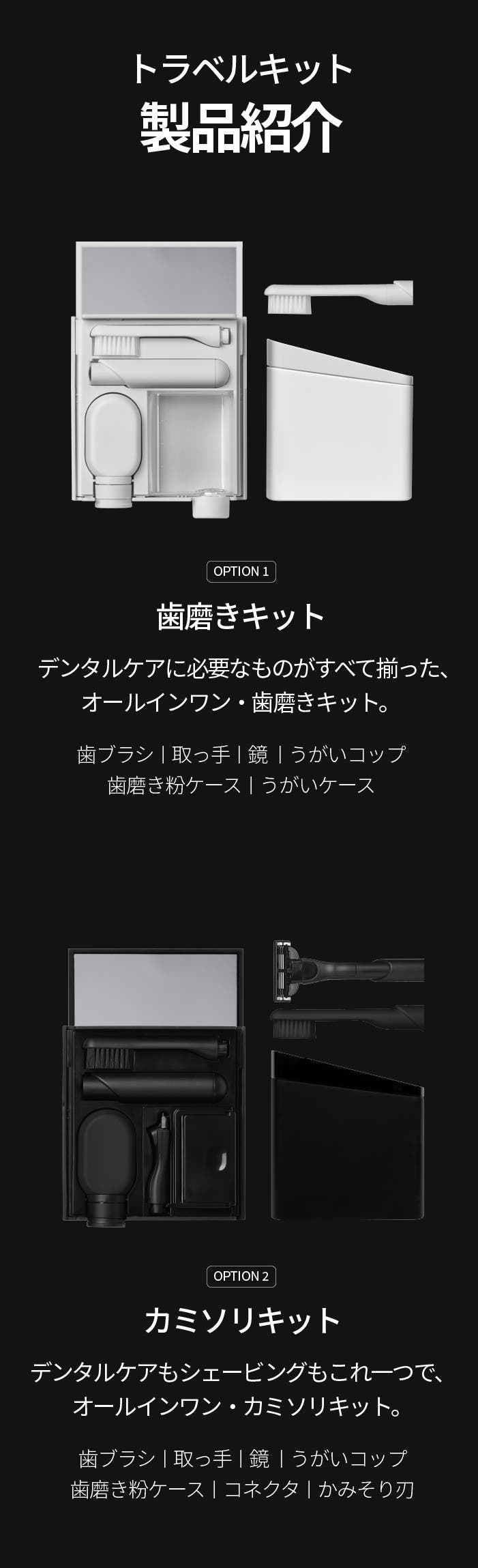 2.セット内容:歯磨きキット本体x1、カミソリキット本体x1、歯磨き粉ディスペンサー、取扱説明書