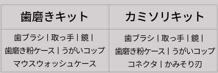 ※歯ブラシは、歯磨きキット・カミソリキットの両方に付属しています。