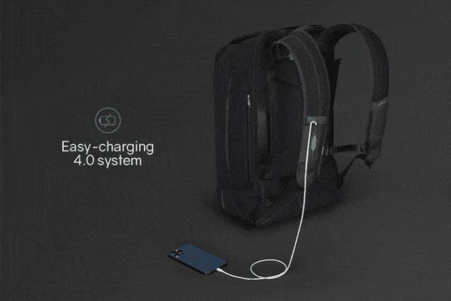 ClickPack Travloは、お手持ちのスマホバッテリーをバッグ内に収納していただき、内部にあるUSBケーブルを繋いで頂くとUSBケーブルの先がショルダーストラップまで配線されたUSBポートよりお手持ちのスマホやガジェット類を充電していただくことができます。