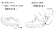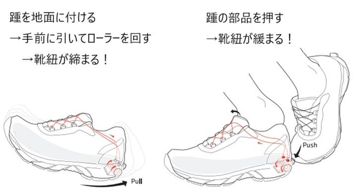 - 手を使わずに靴紐を調整。踵のローラーをスライドさせて靴紐を締め、ボタンを押して緩める。
