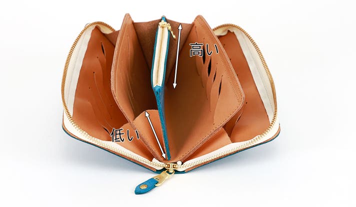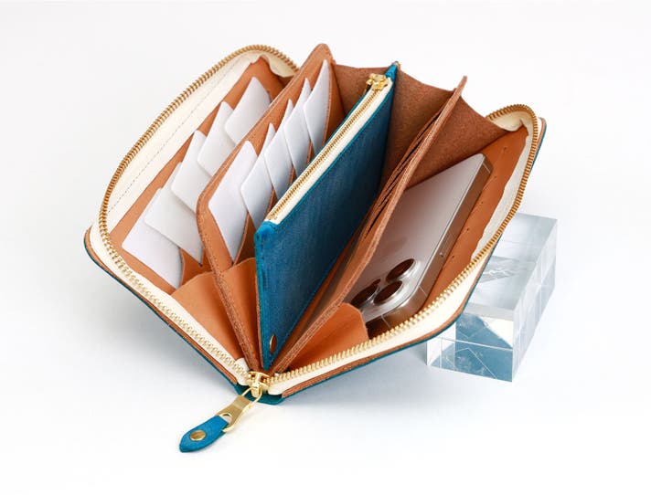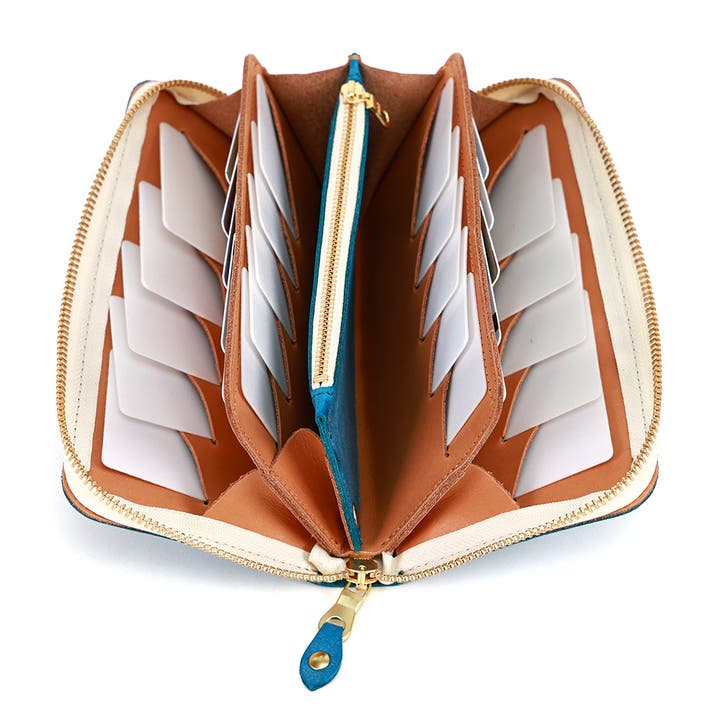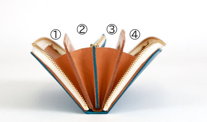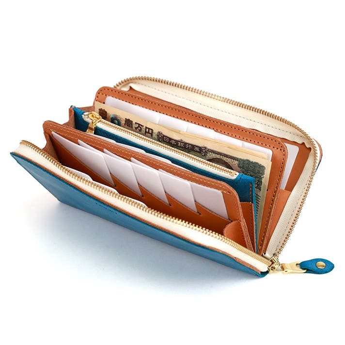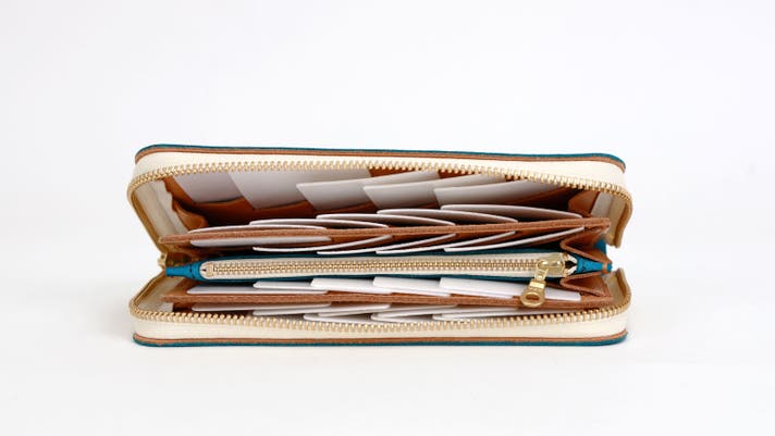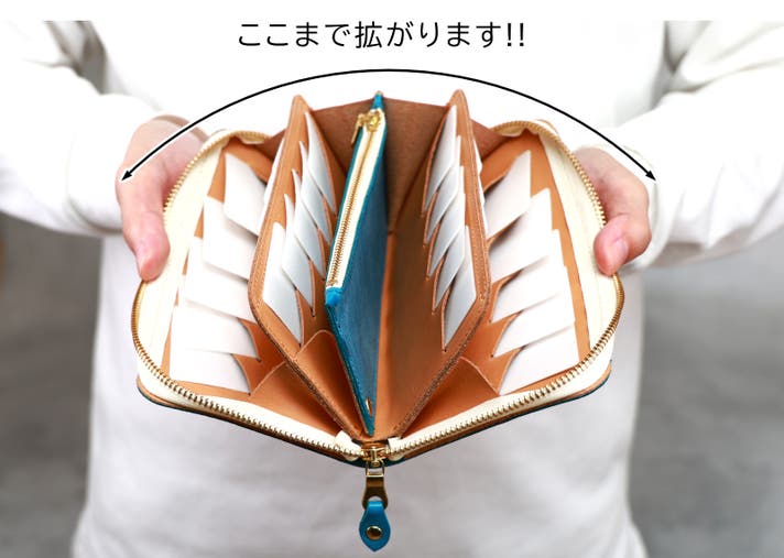 笹マチを4つ繋げた、蛇腹構造のラウンドファスナー財布です。