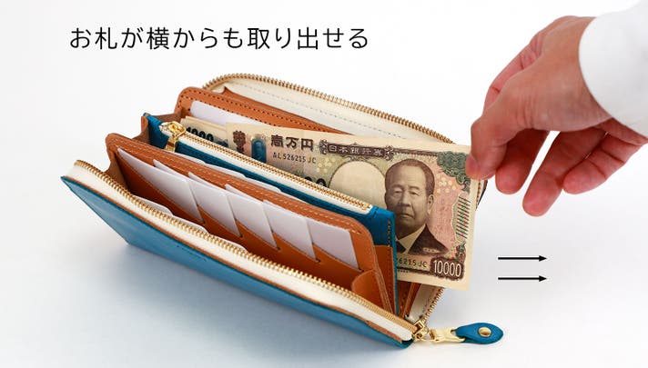 通常の長財布は、上からしかお札が取り出せませんが、マチを外す事により横からもお札を取り出す事が出来ます。