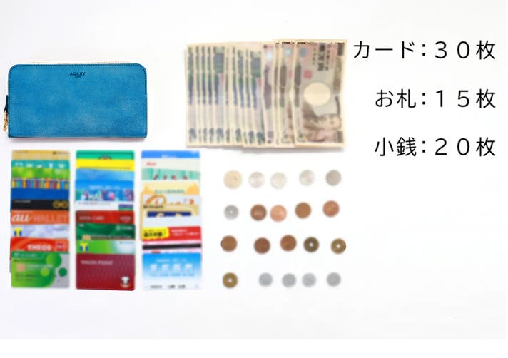 カード30枚・お札15枚・小銭20枚 程度が収納可能です。