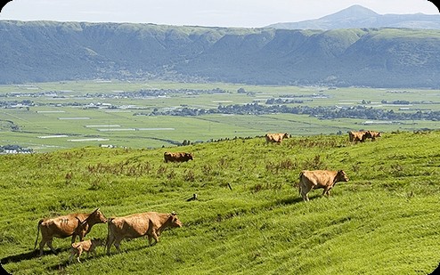 熊本は、赤牛の生産量が全国1位で、赤牛の約70%は熊本産です。一番の理由は熊本の自然環境が、赤牛の飼育に適しているからです。赤牛とは、「あかげ和種」という品種の牛のことです。無駄な脂肪分が少なく、まろやかな赤身がとてもおいしいのが特徴です。赤牛は牧草や稲わらといった「粗飼料」をたくさん食べて育ちます。春から秋までは放牧され、その間は自分たちで自由に草を食べたり、水を飲んだり、のびのびと育つのです。