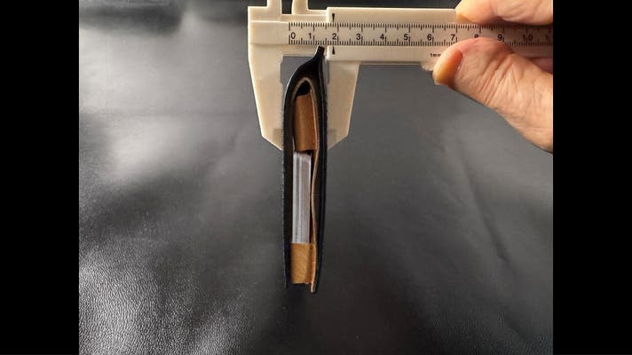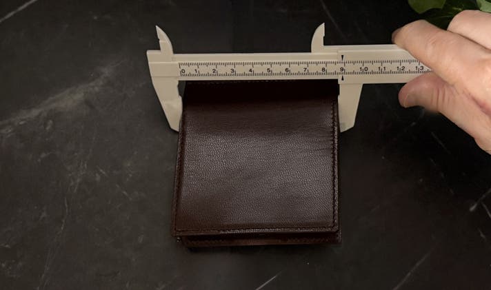 日常的な容量、紙幣8枚・コイン10枚・カード7枚程度では、厚さは12ミリです。