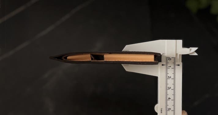 強度に比べてとても軽く、Tri-Laの重量は36gから26.5gへ、26%以上削減できました。触れた印象もしなやかで優しく、服のポケットに入れると柔軟に追随、さりげなく復元します。