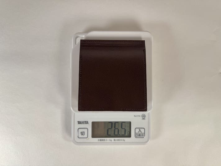 大きさには徹底的にこだわりました。機能を損なわない限り1ミリ単位で断捨離。ミニ財布でも極小と言えるサイズです。特に薄さと軽さの数値は、二つ折り財布では希少です。