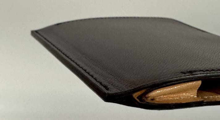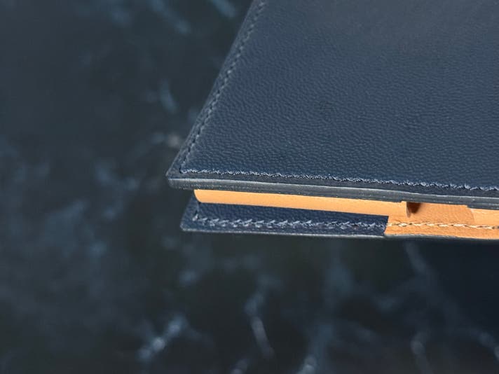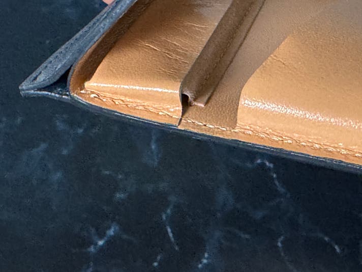 ゴート革が切り替わる部位では、革の色に合うように表と裏で糸の色を変えています。また、紙幣押さえの縁には、念引きと言われる溝を薄く施して、軽いアクセントをつけながら補強しました。