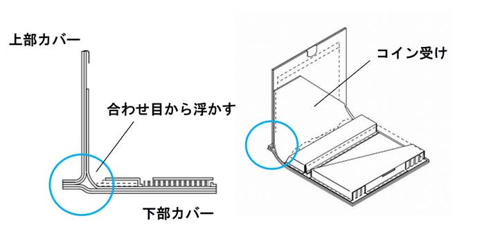 浅型ポケットが苦手にしている「コインの流し入れ」も、コインを面で受けて奥に流し込む特許構造で解決しました。