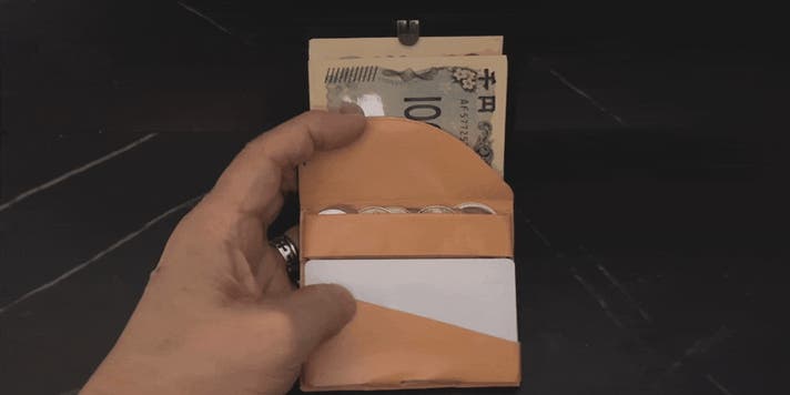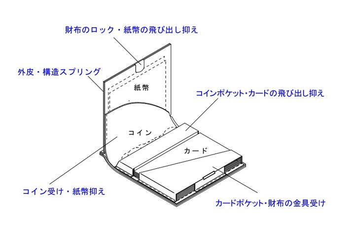 ミニ財布でフルオープンにするには、傾いたり落下してもお金がこぼれ出さない仕組みが必要です。その対策で思いついたのは「開かないマネークリップ」でした。