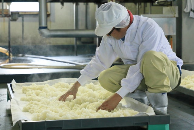 ⑤ 蒸米の放冷も人の手により丁寧に放冷作業を行い適正な温度、蒸米の締り具合を確認してから仕込みを行っています。
